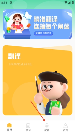 1、打开软件进行首页即提供了翻译功能,在这里点击最下方的配音进入;