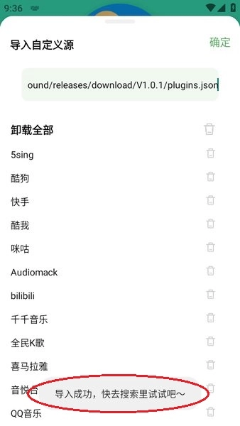 4. 稍等几秒,导入的音源便会显示出来,并提示“导入成功,快去搜索里试试吧”,具体如以下图片所示。