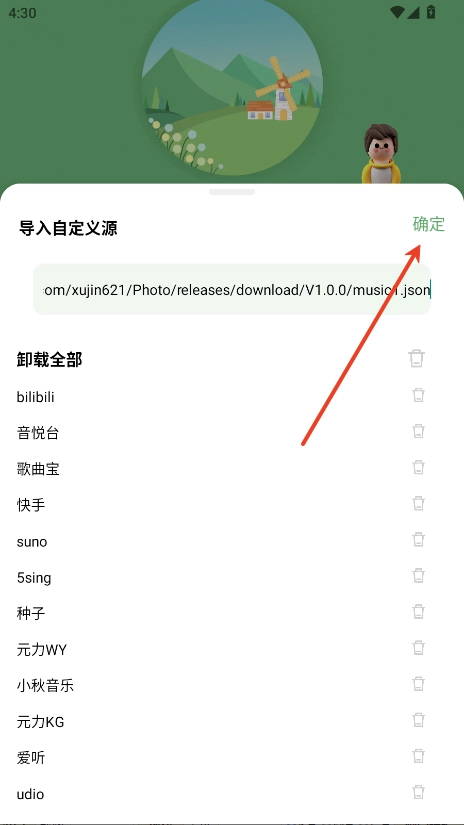 3. 填入自定义源地址:https://gitee.com/xujin621/Photo/releases/download/V1.0.0/music1.json ,随后点击“确定”。