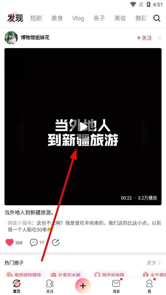 1、打开美拍相机,在首页或者其他页面,找到想要点赞评论的视频,点击进入视频播放界面。