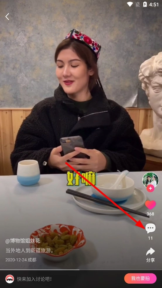 2、进入视频播放界面后,点击视频右侧的评论按钮,会出现评论输入框。