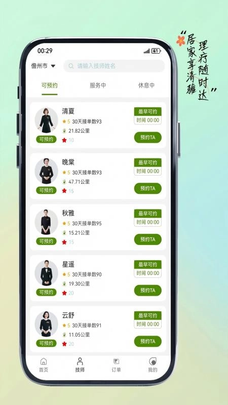 清晰的技师列表都可让你实时查看,筛选附近的技师来轻松预约,查看技师的详情。