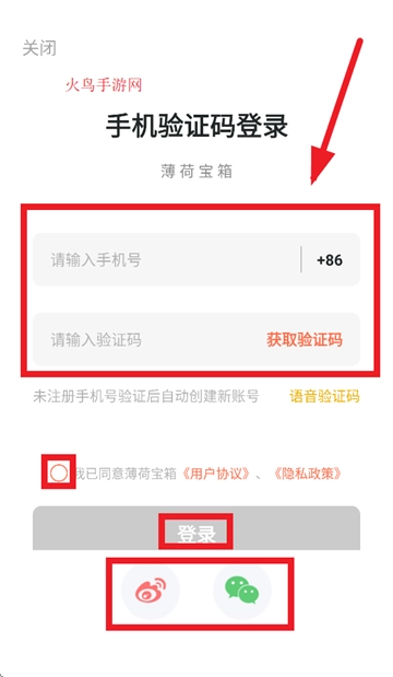 当跳转至登录界面,在相应位置输入手机号和验证码,并勾选“我已同意薄荷宝箱《用户协议》《隐私政策》”,随后点击“登录”按钮即可完成登录操作。若使用的手机号尚未注册,验证通过后系统将自动为您创建新账号。此外,您还能选择通过微博、微信授权的方式进行登录。