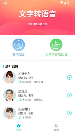 2、主播类型丰富:涵盖男声、女声、童声、方言、英文等不同风格发音人,满足各种场景下对不同音色的需求。
