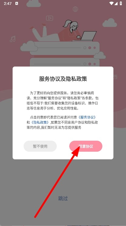 1、打开,在提示框中,点击同意协议按钮。