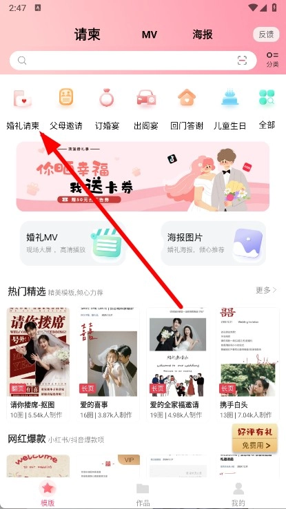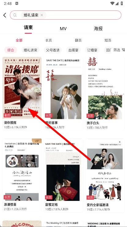 2、点击婚礼请柬选项,进入婚礼请柬模板选择页面。