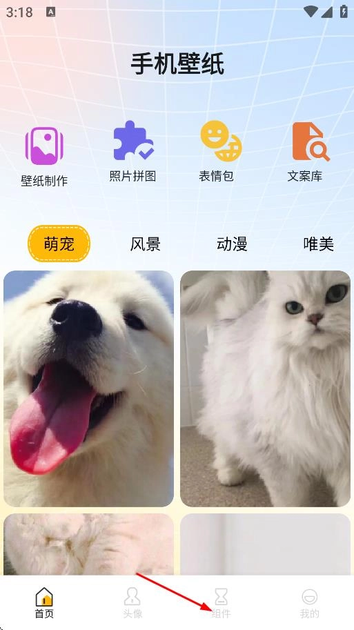 1、在手机壁纸页面,点击底部组件,进入主题组件页面。