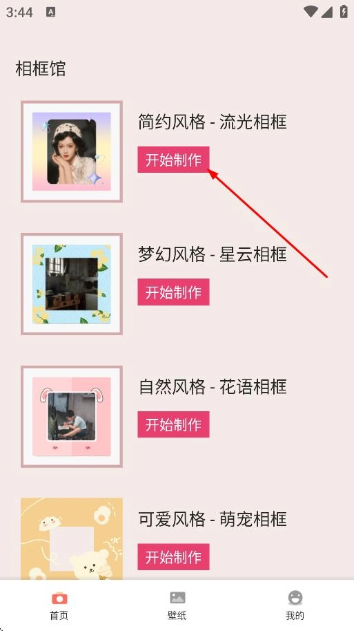 1、在相框馆页面,选择喜欢的相框风格,点击开始制作。