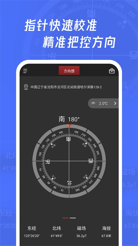 3、轻点左下角的“指南针”图标,此时你便能知晓自己所在位置的经纬度、磁场情况、海拔高度以及天气等信息。
