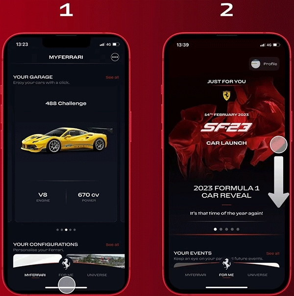 1、要进入MyStore 平台,请单击MyFerrari App主页中的FOR ME 按钮。
