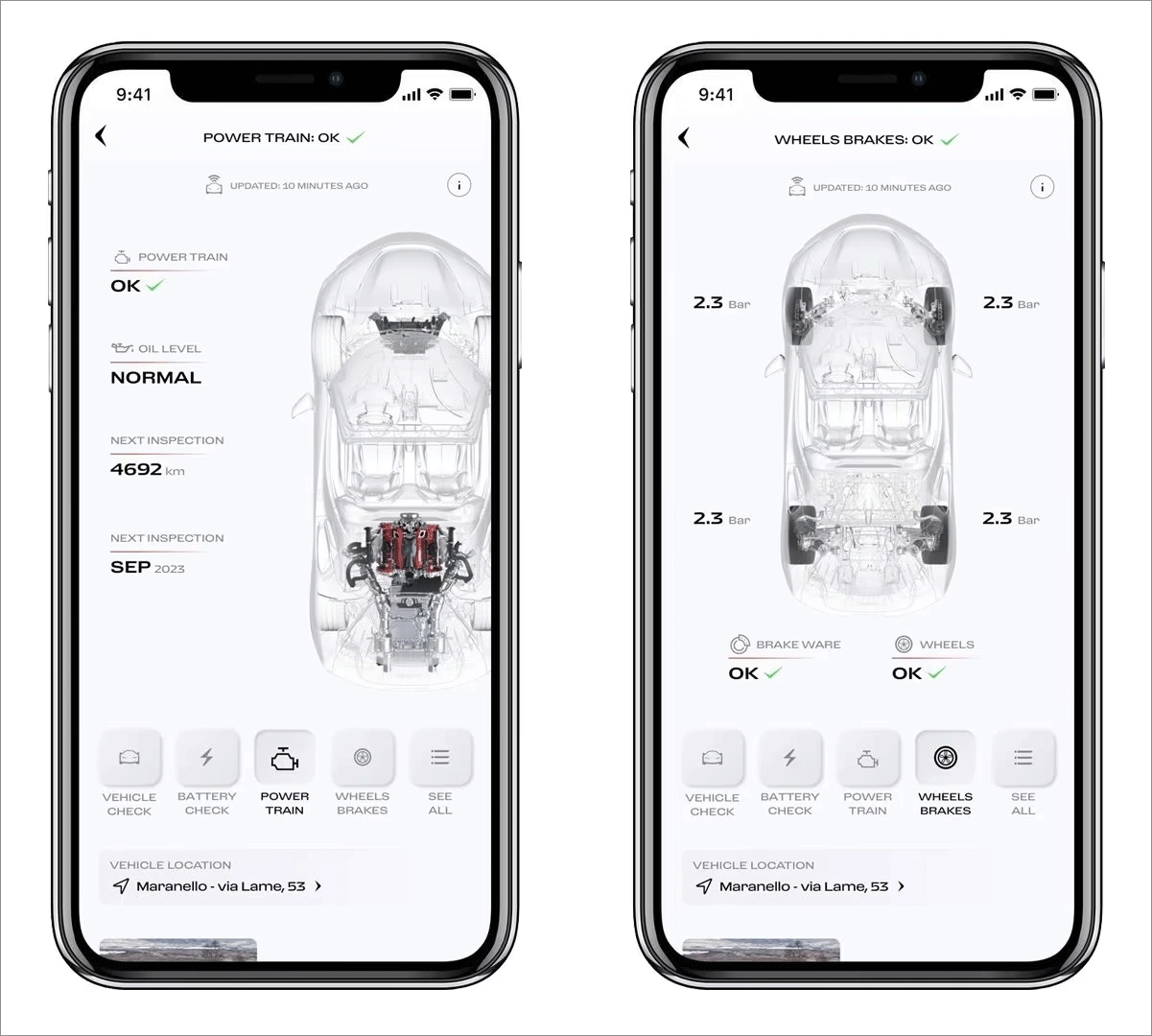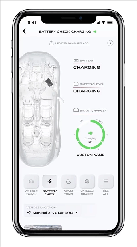2、在“我的车库”板块里,您能够发现有关任何潜在问题的警报信息,以及法拉利Manettino的状态、灯光、传感器、液位情况,还有发动机、制动系统以及高压电池的相关信息(若您的汽车为混合动力插电式汽车)。此外,您还能实时留意汽车的里程表数据及其最后已知位置,该位置即汽车发动机最后关闭的地点。
