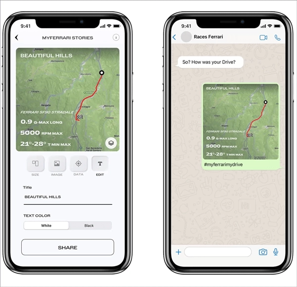 3、Ferrari Stories共享编辑器,让您在社交媒体发布旅行信息变得轻而易举。您能自行挑选想与朋友及关注者分享内容的格式与类型,还可访问专属法拉利图库,为您的帖子增添独特优势。