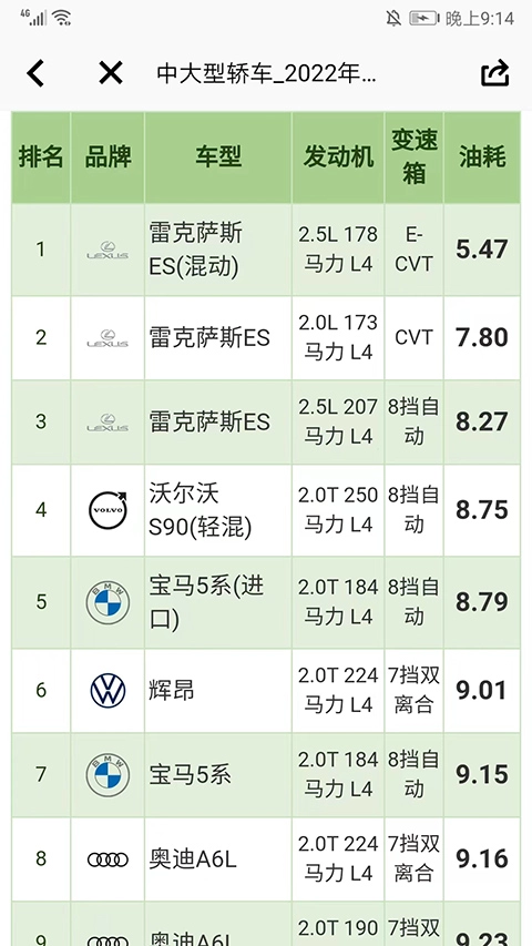4、往下滑动界面,可看到各个车的油耗情况了,并且是按油耗从低到高依次排序。