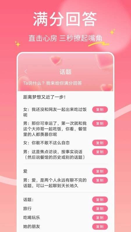 1. 为你提供开场白、搭讪语录以及幽默话术,助力你毫无压力地开启话题,从容应对日常互动和约会场景,更有土味情话为交流增添别样趣味。