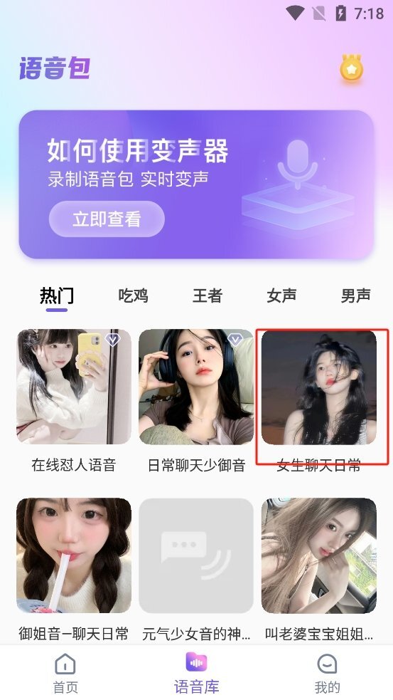 2、进入语音库后,你会看到各式各样的语音选项,这里我们以女生日常聊天语音包为例。