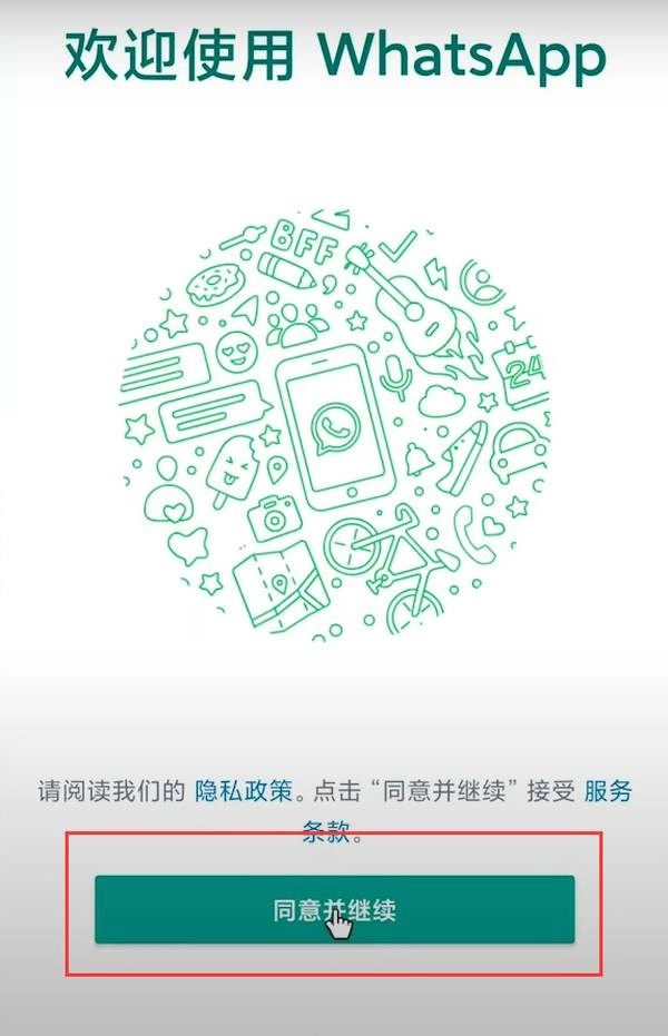2、打开WhatsApp,我们会来到下面的界面,我们点击“同意并继续”。