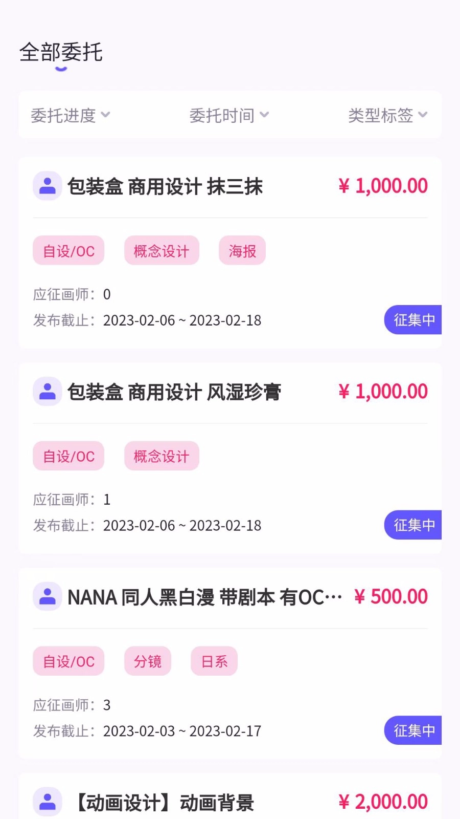 2、这里约稿是没有任何限制的,画师们都可以自由查看各种委托单。