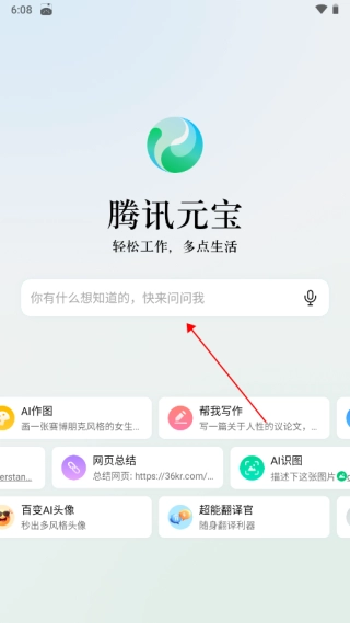 您可以随时与元宝发起对话,元宝会通过强大的模型和搜索能力给您精准的答案,搜答案,搜资料,搜灵感,一问即达,信息搜索更轻松。
