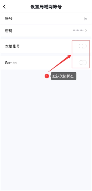 3、设置完成后,我们可看到当前本地账号和Samba默认为关闭状态
