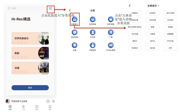 3、在“发现”页面,点击其上方右上角的图标,便能看到“经典分类”“世界民族”“有声读物”“音乐时期”“艺术家”等九个分类版块。点击相应版块,就可查看更详细的分类。