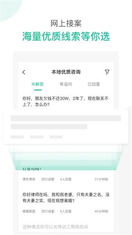用户能够借助文字与图片向平台提出咨询,律师将依据用户所处地区以及问题的专业性来进行推送。一旦接单,你便能直接为用户答疑解惑,既快速高效,又简单直接。