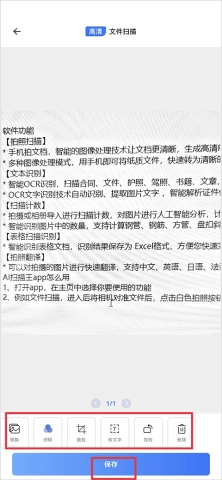 3、拍照完成后,应用会为您生成处理好的文档,您还能够对文件执行裁剪、添加滤镜、转为文字、旋转等操作,操作结束后点击保存就行。