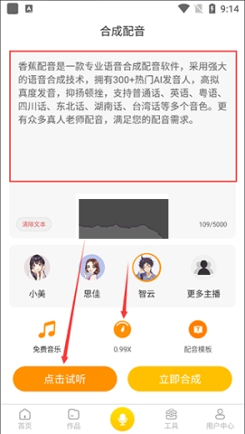 2、在文本框输入文字,软件支持一键粘贴,选择您喜欢的主播和调节试听效果。