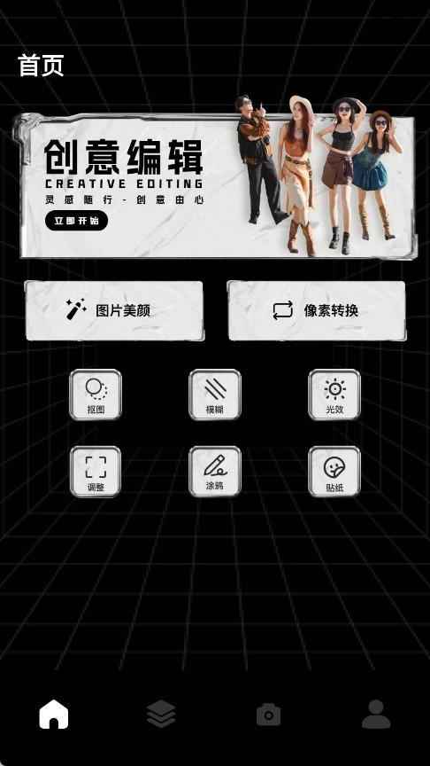 这款软件打开后具备图片美颜、像素转换、抠图、模糊、光效以及调整等多种功能。