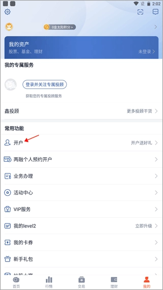 进入软件首页后,可点击页面上方的“开户”选项;此外,也能切换至【我的】页面,在该页面中找到并点击开户功能。
