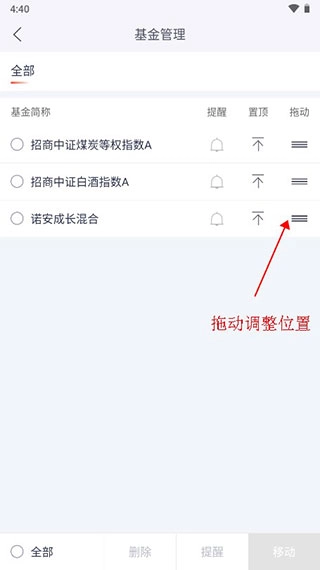 点击自选项目右侧的三条横线图标并拖动,即可重新排列自选项目的顺序,具体操作可参考图示。
