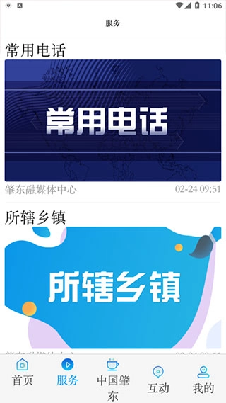 点击“服务”后,就能查看肇东市的各类常用电话以及不同的组织架构信息。