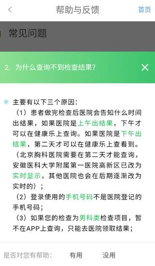 患者做完检查后医院会告知什么时间出结果,如果医院是上午出结果,下午才可以在健康乐上查询。如果医院是下午出结果,第二天才可以在健康乐上查看到。(北京胸科医院需要在第二天才能查询,安徽医科大学附属第一医院高新区已改为实时显示,其他医院也会在后期逐渐改为实时的);