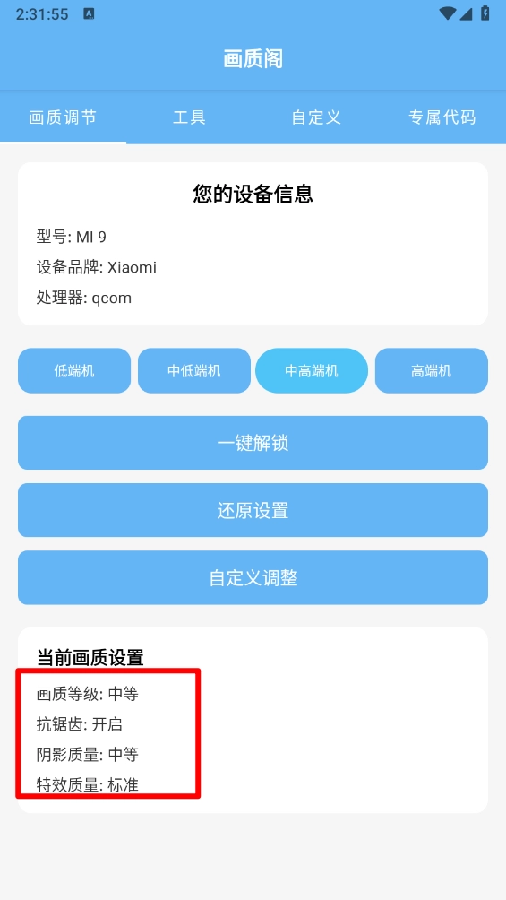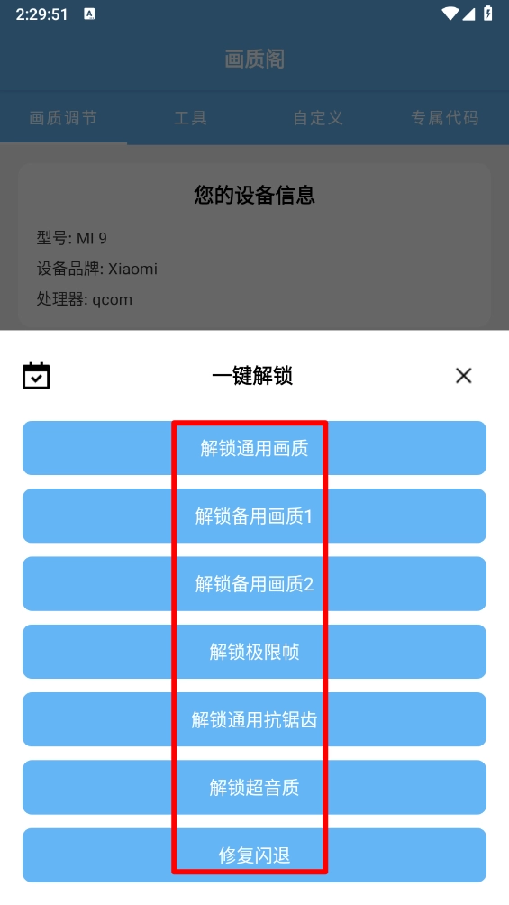 2、进入主要画质调节页面,可以查看你个人设备信息,解锁对应的机型。