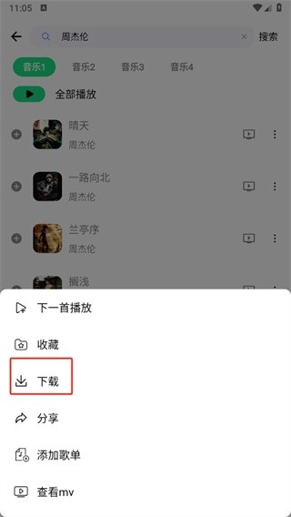 4、最后点击后会弹出下一首播放、收藏、分享、添加歌单、查看MV等选项,我们点击【】即可;