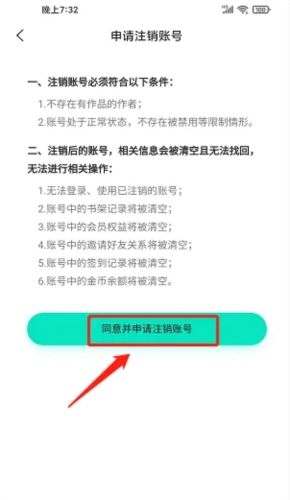 4、进入账号注销申请界面后,点击【同意并申请注销账号】按钮。