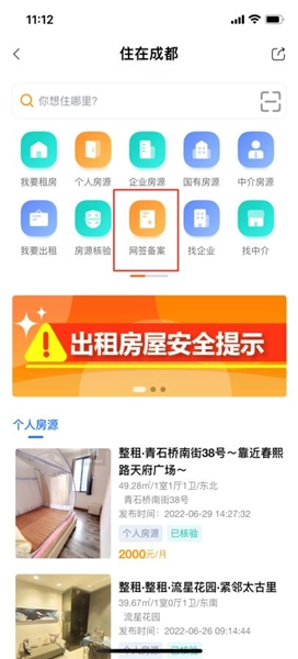 天府活力市场手机版搜索“住房租赁”或点击首页“住在成都”进入住房租赁服务,点击“网签备案”即可进入备案页面。