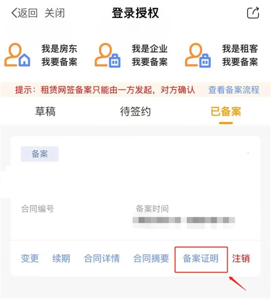 签约成功后,系统将自动审核备案,点击查看“备案证明”就可以保存到手机中,打印使用。