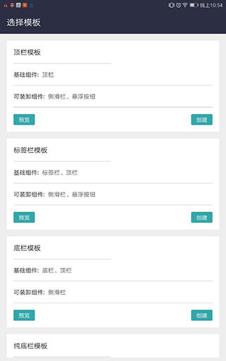 2、包含顶栏模板、标签栏模板、底栏模板、纯底栏模板和空白模板这几种类型。用户可根据自身需求选择,此处选用了顶栏模板。接着输入应用名称,点击创建按钮即可。