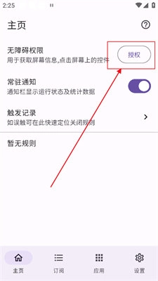 1、开启跳过广告功能需先开启无障碍权限,打开软件后点击【授权】即可。