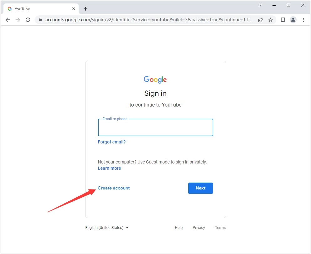 2、接着会跳转到谷歌的注册页面(由于谷歌与YouTube同属一家公司的产品),我们点击页面底部的“Create account”按钮。