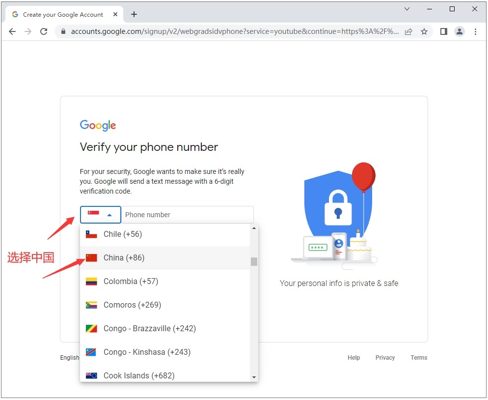6、进入该页面后,请选择您所在国家对应的手机区号。若您位于中国境内,则需选择“+86”这一区号。