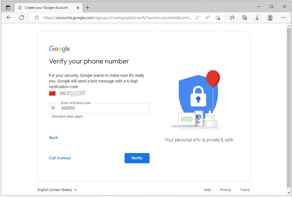 8、请输入您手机收到的验证码。不少人会在这一步遇到阻碍,主要原因是浏览器未使用英文模式,进而导致无法接收验证码,还会被谷歌提示“此电话号码不能用于验证”。