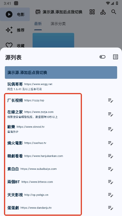 你可以在“源列表”里挑选一个视频源,点击就能完成切换,不过有少数可能会加载失败。