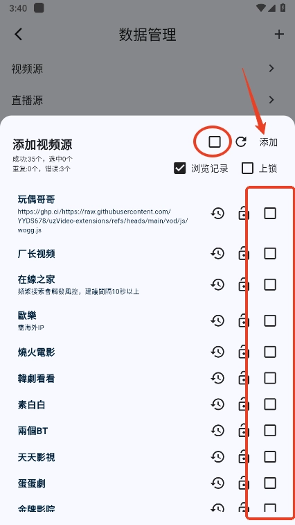 等待片刻后,等出现视频源后,勾选全部,点击“添加”;