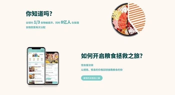 “惜食”推出了创新性的解决办法,借助“惜食”平台,商家发布生产过剩的魔法袋,用户用非常低的折扣进行购买,“惜食人+惜食+惜食商家”共同达成零浪费、环保绿色的低碳生活。