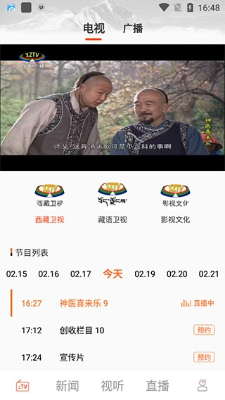 2. 点击页面左侧的广播选项,即可查看西藏卫视、藏语卫视、影视文化频道的电视直播,也能收听各类广播节目。
