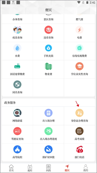 1、打开并进入【首页】,切换到【便民】页面,点击政务服务的“身份证办理查询”。