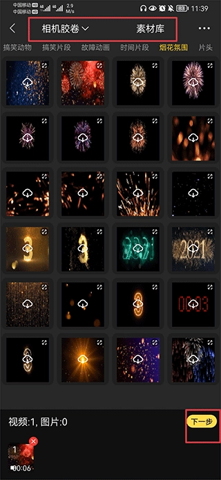 2、进入后,可在相册里挑选需要剪辑的视频,也能从素材库中选取心仪的素材,接着点击下一步。