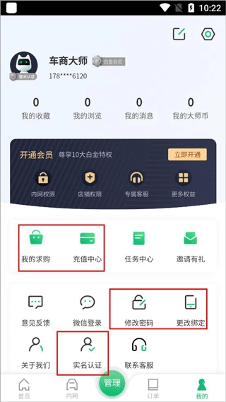 3、管理版块可解锁多项功能,包括我的店铺管理、车商店铺、库存管理以及营销分享等。