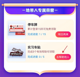2、进入新人专区后,滑动页面至底部的地带人专属荣誉板块,完成“去帮助他人”的任务就能领取车贴了。